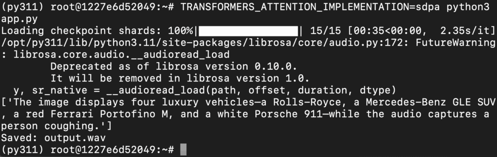 - Builds a multimodal chat: one image URL, one audio URL, and a short user text prompt.
