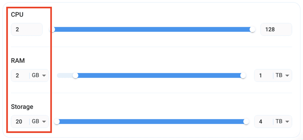 - Most importantly, select the correct specifications for your VM according to your workload requirements by sliding the bars for each option.
