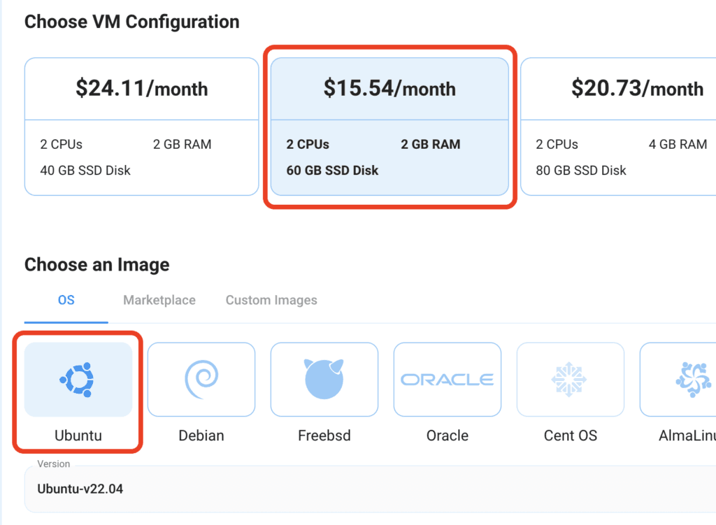 - After selecting your required configuration options, you’ll see the available VMs in your region and as per (or very close to) your configuration. In our case, we’ll choose a ‘2vCPUs/2GB/60GB SSD’ as the closest match to the “Prerequisites”.