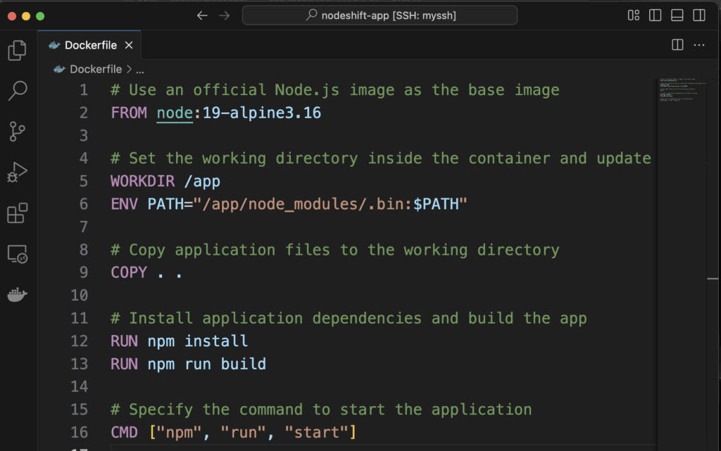 Once you have installed Docker on Ubuntu (as mentioned in Prerequisites) and connected to the Visual Studio Code editor, proceed to create a Dockerfile for your application.