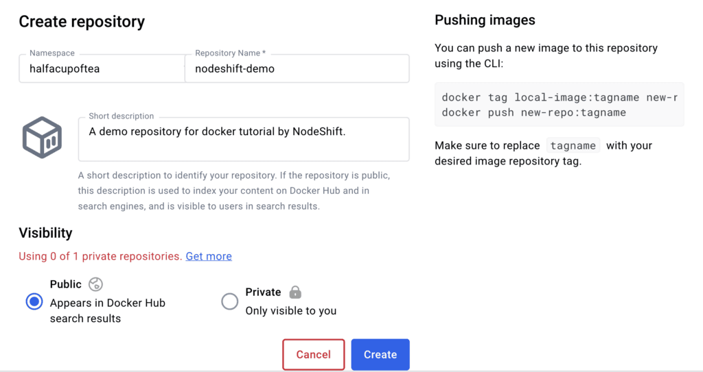 4. Fill in the necessary details and click Create to create the repository.