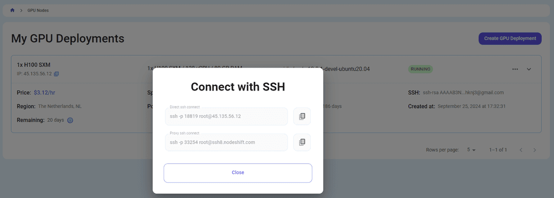 NodeShift GPUs can be connected to and controlled through a terminal using the SSH key provided during GPU creation.