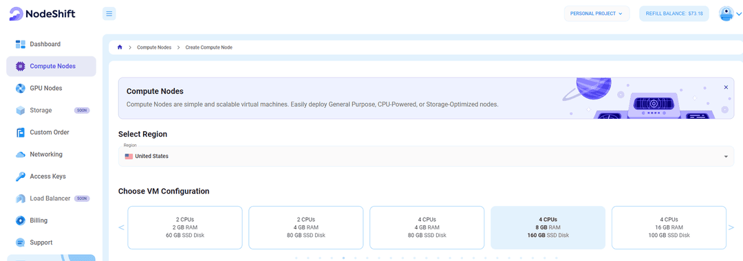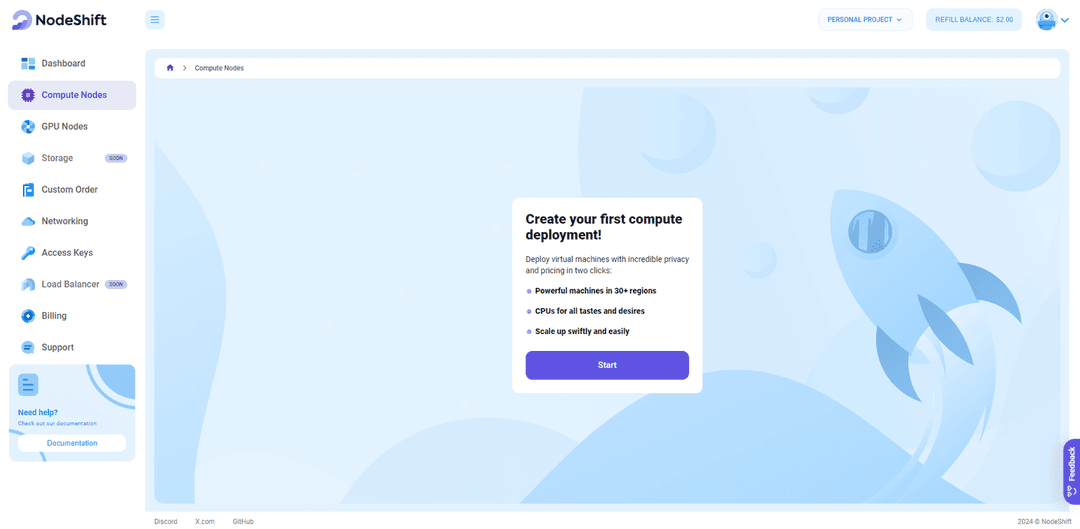NodeShift Compute Nodes offers flexible and scalable on-demand resources like NodeShift Virtual Machines which are easily deployed and come with general-purpose, CPU-powered, or storage-optimized nodes.