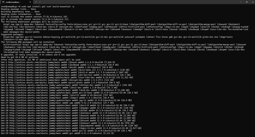 is used in Ubuntu and other Debian-based Linux distributions to install three essential software packages: git, curl, and build-essential.