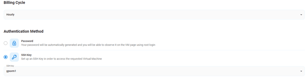 - Select the billing cycle that best suits your needs. Two options are available: Hourly, ideal for short-term usage and pay-as-you-go flexibility, or Monthly, perfect for long-term projects with a consistent usage rate and potentially lower overall cost.