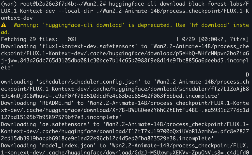 huggingface-cli download black-forest-labs/FLUX.1-Kontext-dev --local-dir ./Wan2.2-Animate-14B/process_checkpoint/FLUX.1-Kontext-dev