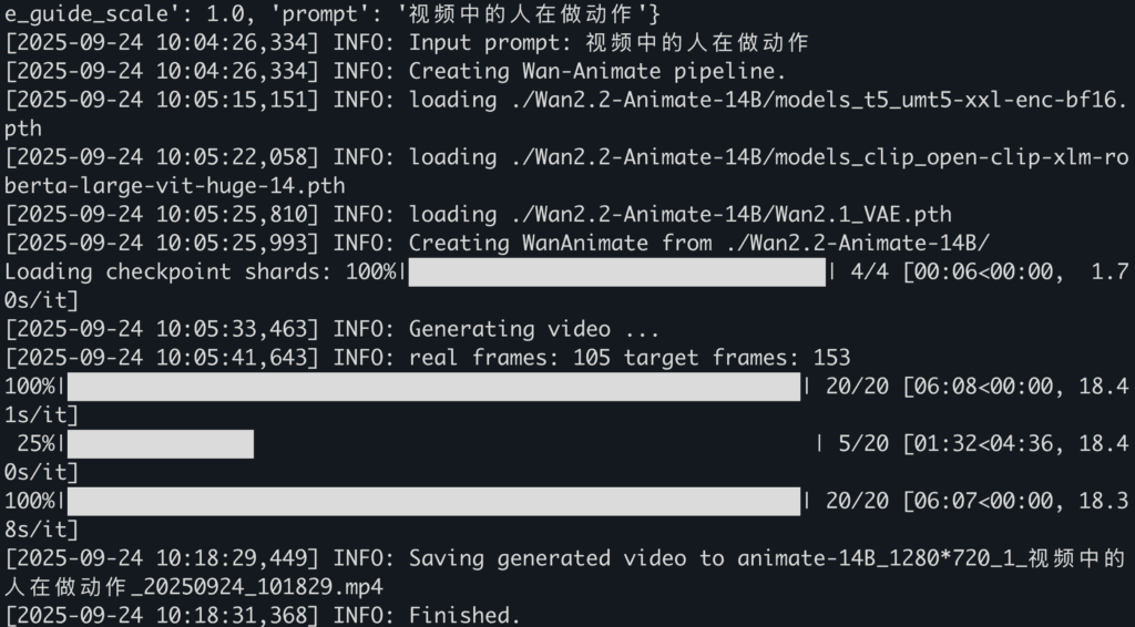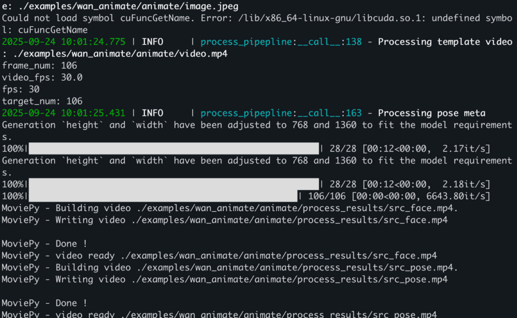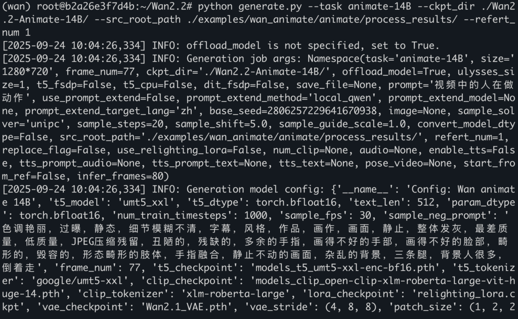 python generate.py --task animate-14B --ckpt_dir ./Wan2.2-Animate-14B/ --src_root_path ./examples/wan_animate/animate/process_results/ --refert_num 1