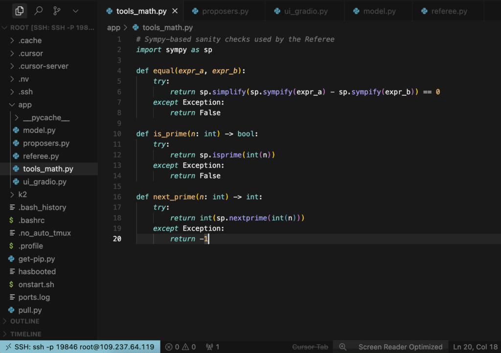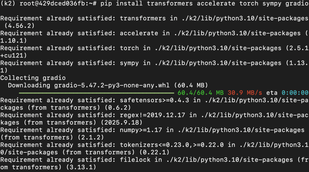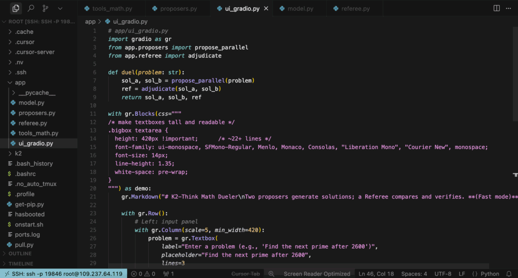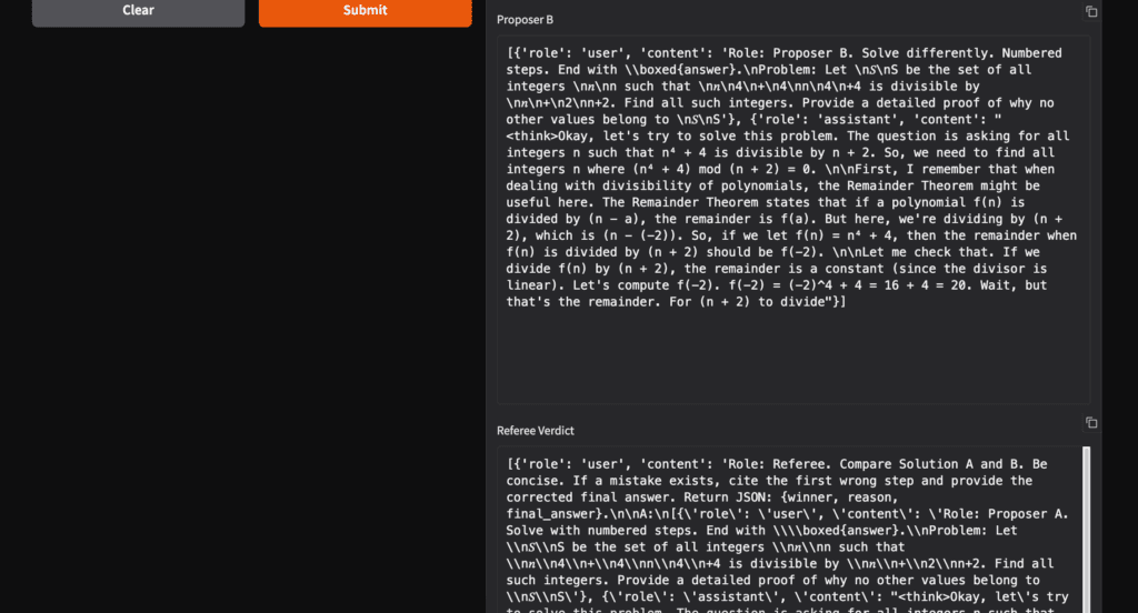 With this guide, you’ve gone from pulling the K2-Think model to building a complete Math Dueler Agent that runs locally on your GPU VM. You now have two proposer agents solving problems in different ways and a referee agent verifying and declaring the winner—all wrapped in a clean Gradio interface. This project not only showcases the reasoning power of K2-Think but also gives you a foundation to expand: add new tools, bring in more domains beyond math, or even adapt the referee to handle richer verification pipelines. The key takeaway—K2-Think isn’t just a model you run; it’s a powerful reasoning engine you can turn into interactive, verifiable applications.
