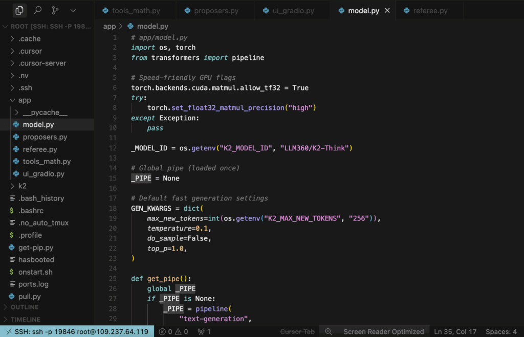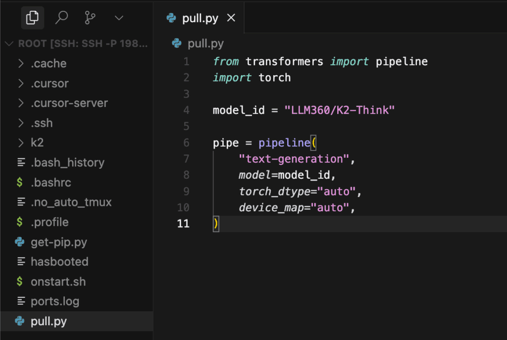 Before you start running agent script with the K2-Think model, it’s a good idea to connect your GPU virtual machine (VM) to a code editor of your choice. This makes writing, editing, and running code much easier.