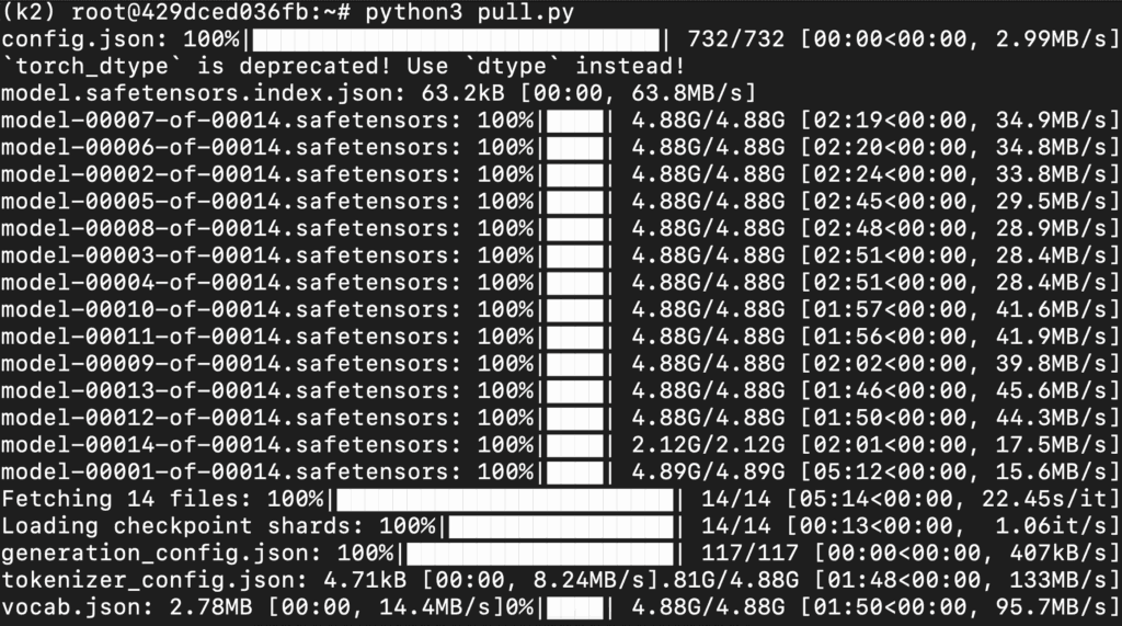 This step verifies that all model shards are downloaded correctly and confirms the pipeline initializes without errors. Once you see the progress bars finish and the checkpoint shards load to 100%, the model is ready to use.