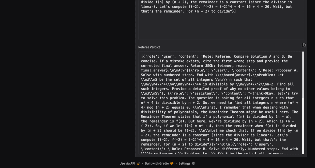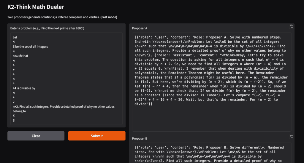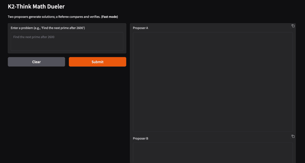 gr.Markdown("# K2-Think Math Dueler\nTwo proposers generate solutions; a Referee compares and verifies. **(Fast mode)**")