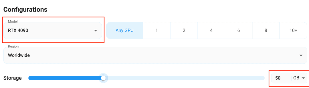 Step 3: Selecting configuration for GPU (model, region, storage)