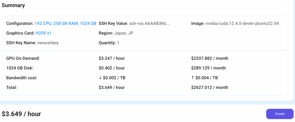 - After selecting your required configuration options, you’ll see the available GPU nodes in your region and according to (or very close to) your configuration. In our case, we’ll choose a 1x H200 140GB GPU node with 192 vCPUs/252GB RAM/500GB SSD.