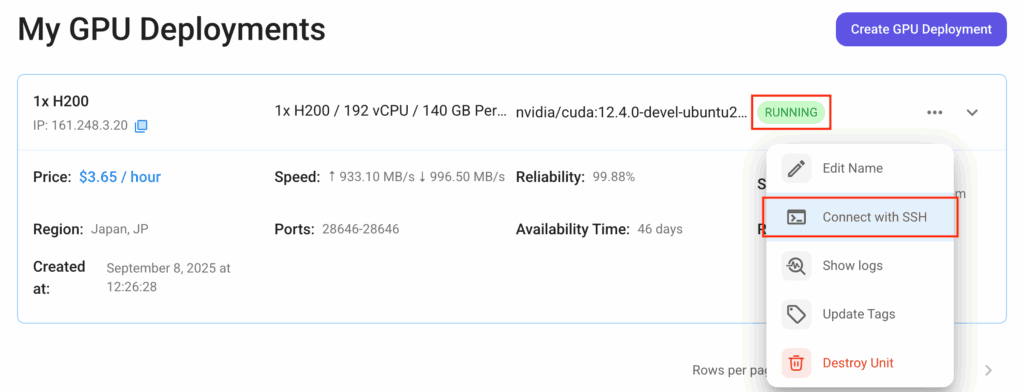 - Once your GPU shows this status, navigate to the three dots on the right, click on Connect with SSH, and copy the SSH details that appear.