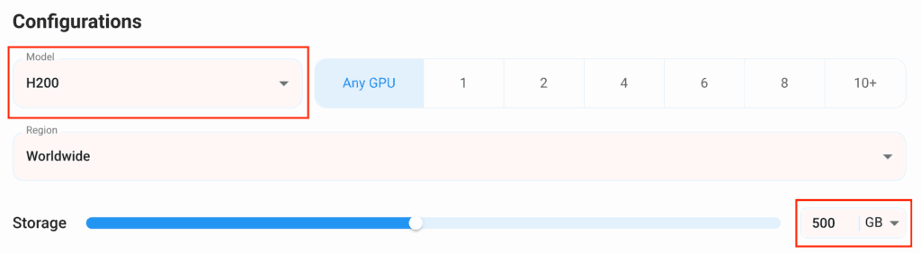 - Similarly, we’ll opt for 200GB storage by sliding the bar. You can also select the region where you want your GPU to reside from the available ones.