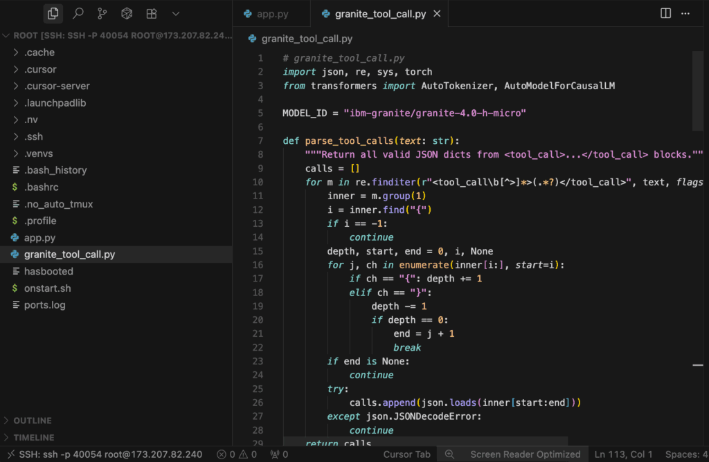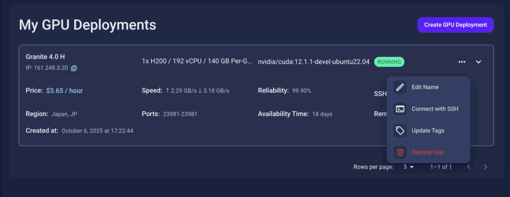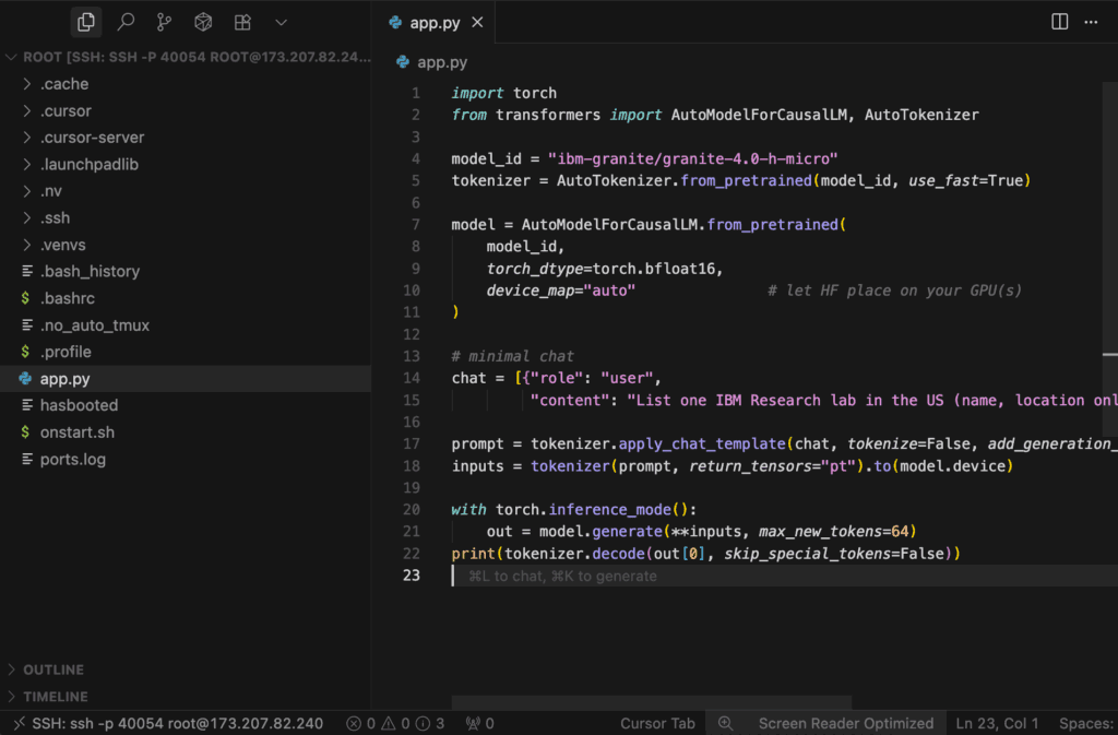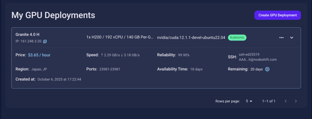 This gives us SSH access and full control over terminal operations — perfect for installing dependencies, running benchmarks, and launching tools like IBM Granite 4.0 H Tiny, Small and Micro.