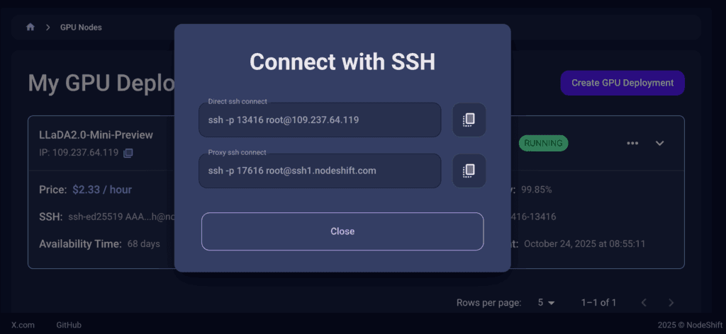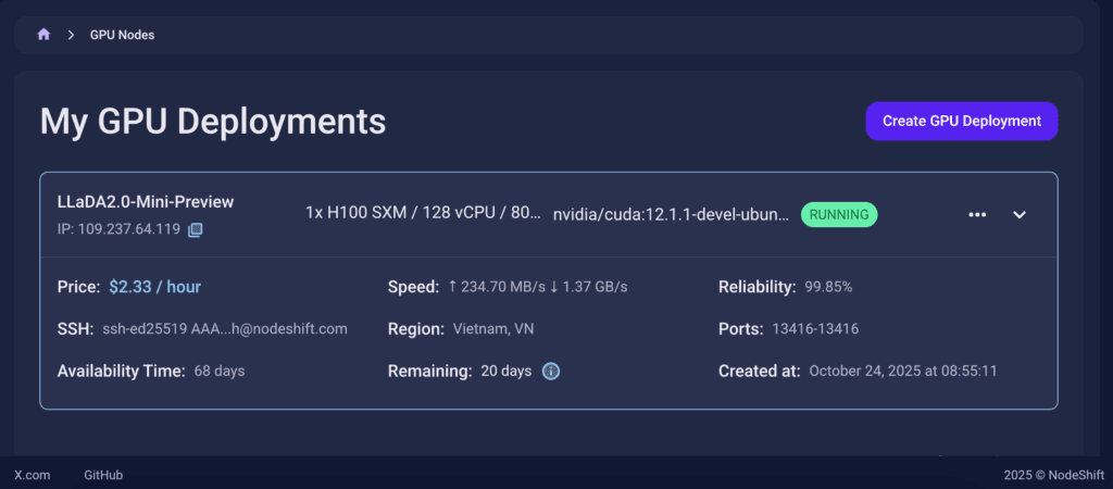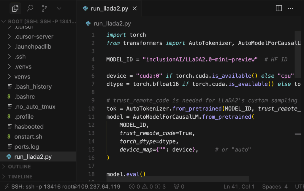 This gives us SSH access and full control over terminal operations — perfect for installing dependencies, running benchmarks, and launching models like LLaDA2.0-Mini-Preview.