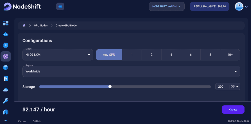 GPU Nodes are NodeShift’s GPU Virtual Machines, on-demand resources equipped with diverse GPUs ranging from H200s to A100s. These GPU-powered VMs provide enhanced environmental control, allowing configuration adjustments for GPUs, CPUs, RAM, and Storage based on specific requirements.