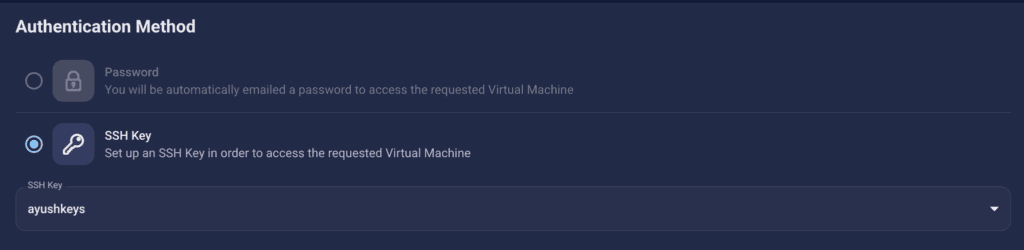 There are two authentication methods available: Password and SSH Key. SSH keys are a more secure option. To create them, please refer to our official documentation.
