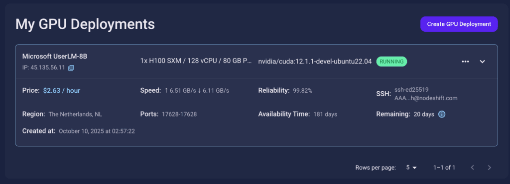 This setup ensures that the Microsoft UserLM-8B runs in a GPU-enabled environment with proper CUDA access and high compute performance.