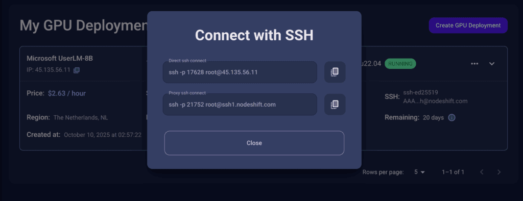 This gives us SSH access and full control over terminal operations — perfect for installing dependencies, running benchmarks, and launching models like Microsoft UserLM-8B.