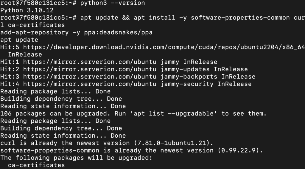 If you check the version of the python, system has Python 3.10.12 available by default. To install a higher version of Python, you’ll need to use the deadsnakes