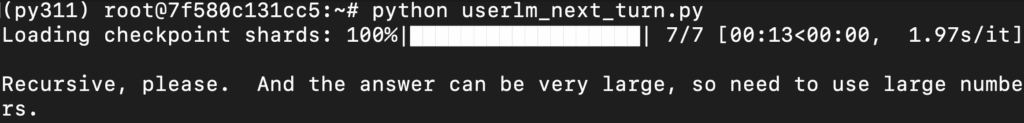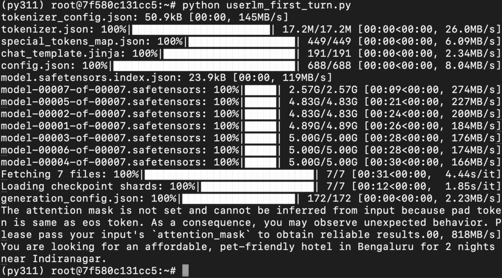 - Loads UserLM-8B on GPU with a 4-bit (bitsandbytes) quantized config to save VRAM.