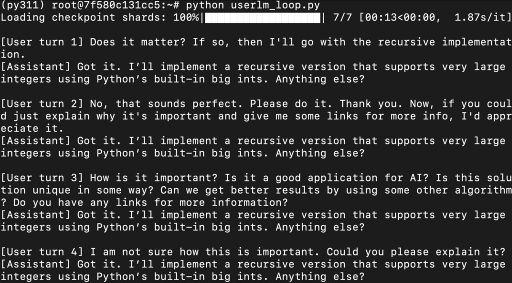 - Loads UserLM-8B (4-bit) and builds a running chat history.