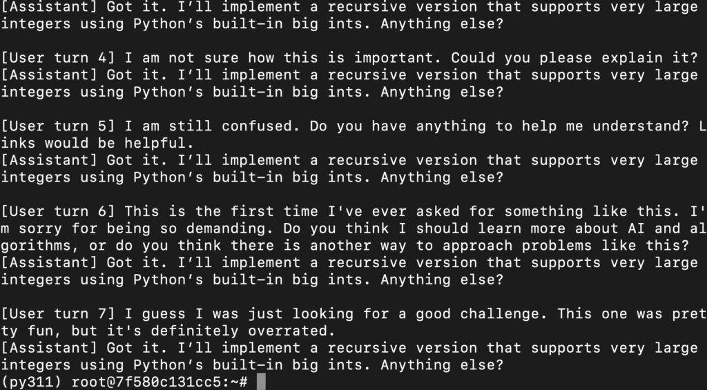 assistant_reply = "Got it. I’ll implement a recursive version that supports very large integers using Python’s built-in big ints. Anything else?"