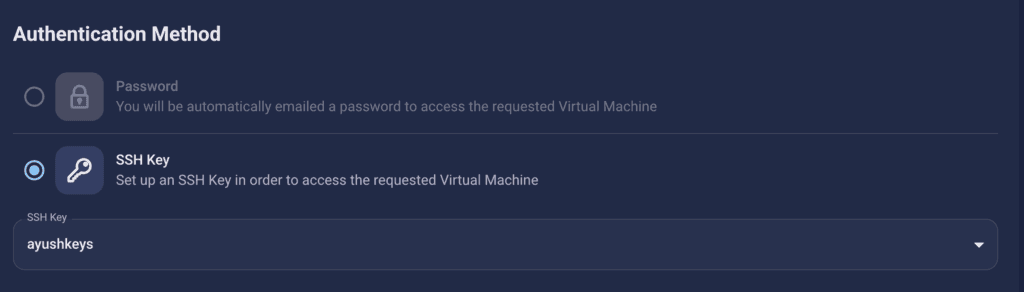 There are two authentication methods available: Password and SSH Key. SSH keys are a more secure option. To create them, please refer to our official documentation.