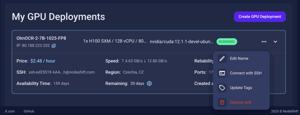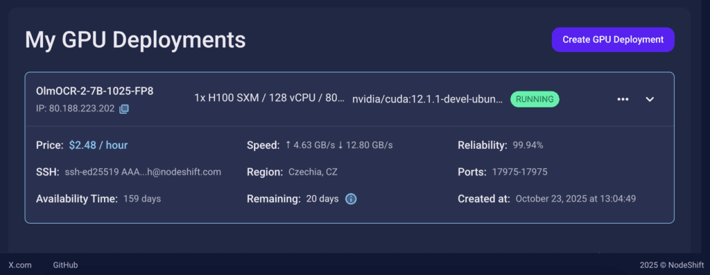 This gives us SSH access and full control over terminal operations — perfect for installing dependencies, running benchmarks, and launching models like OlmOCR-2-7B-1025-FP8.