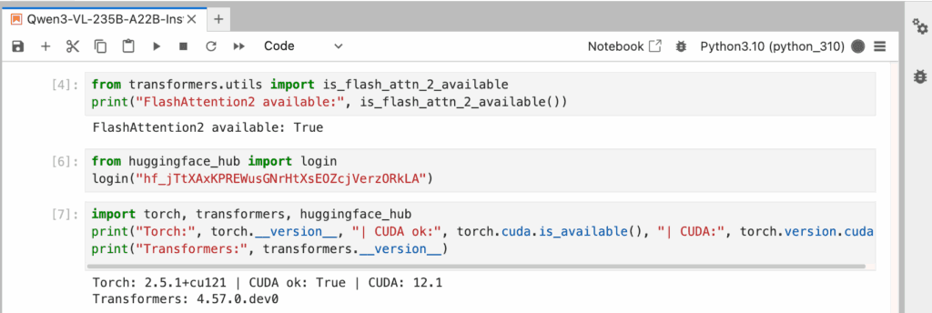 Log in so the VM can download the weights, then confirm FlashAttention2 and your CUDA/versions are good.