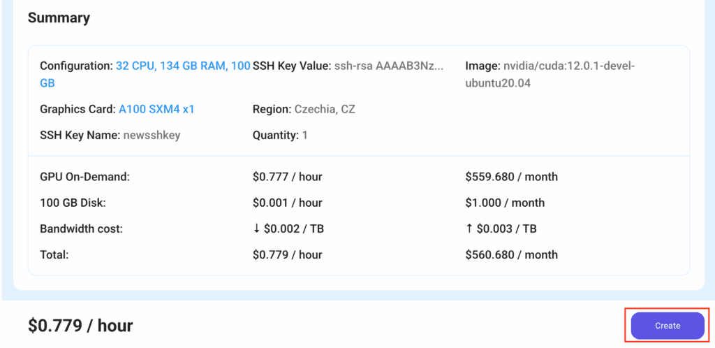 That’s it! You are now ready to deploy the node. Finalize the configuration summary, and if it looks good, click Create to deploy the node.