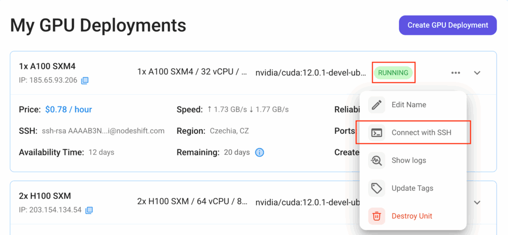 - Once your GPU shows this status, navigate to the three dots on the right, click on Connect with SSH, and copy the SSH details that appear.