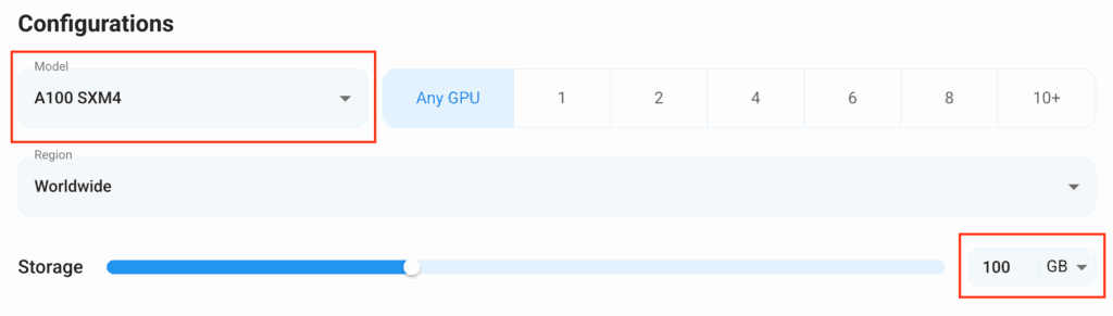 - Similarly, we’ll opt for 100GB storage by sliding the bar. You can also select the region where you want your GPU to reside from the available ones.