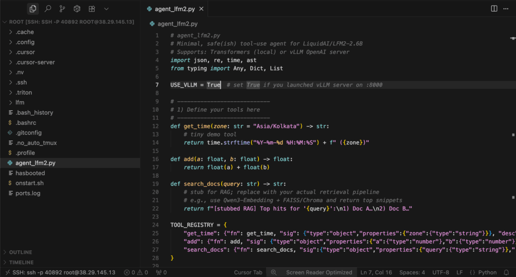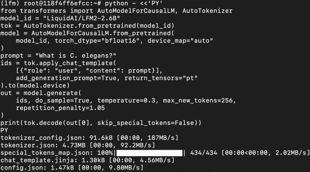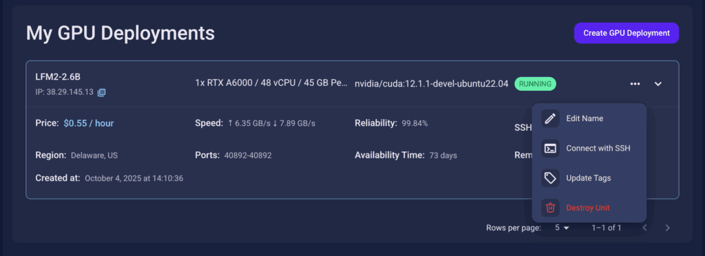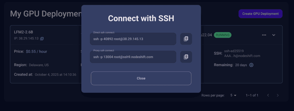 This gives us SSH access and full control over terminal operations — perfect for installing dependencies, running benchmarks, and launching models like LFM2-2.6B.