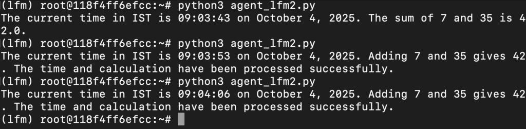 - Prints the final answer for the demo query (“IST time + 7+35 + summary”), showing the agentic behavior working end-to-end.