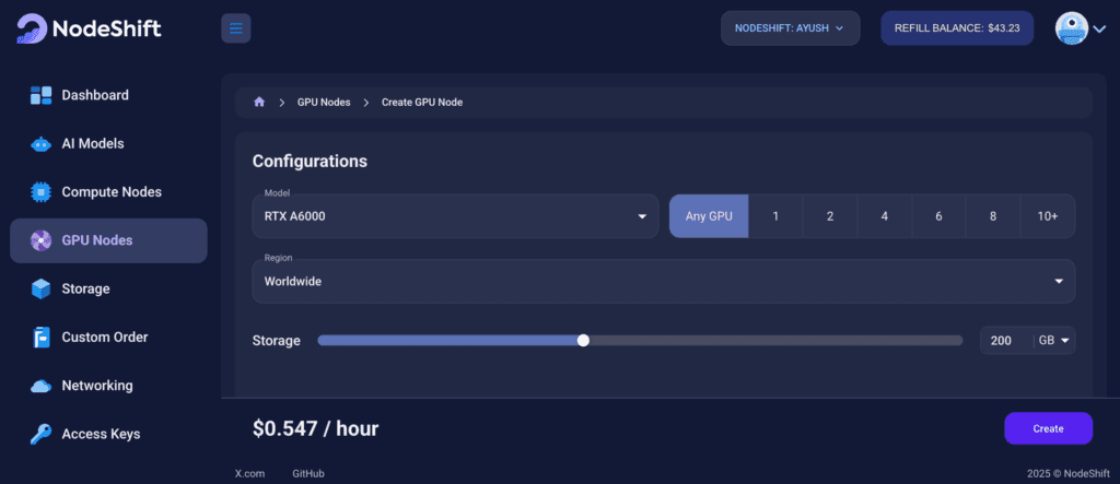 GPU Nodes are NodeShift’s GPU Virtual Machines, on-demand resources equipped with diverse GPUs ranging from H200s to A100s. These GPU-powered VMs provide enhanced environmental control, allowing configuration adjustments for GPUs, CPUs, RAM, and Storage based on specific requirements.