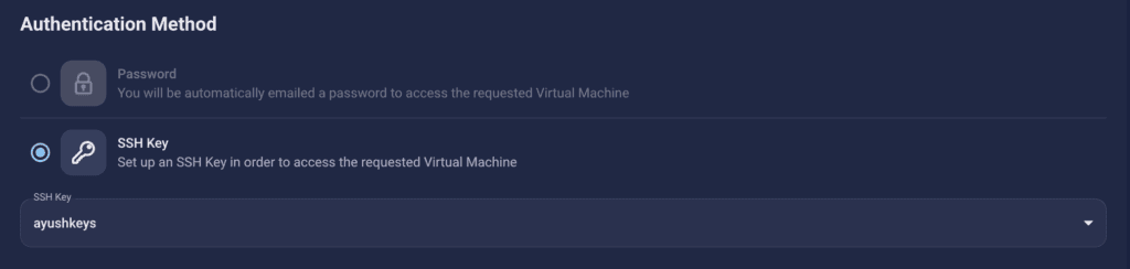 There are two authentication methods available: Password and SSH Key. SSH keys are a more secure option. To create them, please refer to our official documentation.