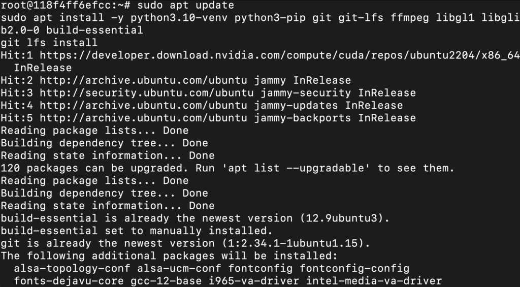 sudo apt install -y python3.10-venv python3-pip git git-lfs ffmpeg libgl1 libglib2.0-0 build-essential